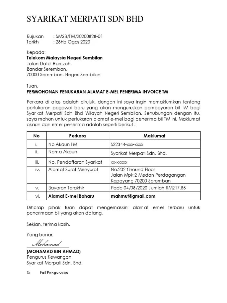 Format Surat Rasmi Tukar Alamat Rasmi Sub from imgv2-2-f.scribdassets.com Contoh surat pertukaran alamat surat menyurat. Permohonan pertukaran alamat surat menyurat merujuk kepada perkara di atas kp : Aturan tersebut ditujukan agar informasi yang. Form for change of permanent address and correspondence address. Maklumat pinjaman saya adalah seperti berikut: Borang ini adalah bertujuan dalam pengemaskinian maklumat alamat surat menyurat bil . Borang ini adalah bertujuan dalam pengemaskinian maklumat alamat surat menyurat bil cukai taksiran secara online. Surat rasmi pertukaran alamat rumah crv turbin. Contoh surat pertukaran alamat syarikat kepada bank. Saya memohon pertukaran surat menyurat ke alamat .