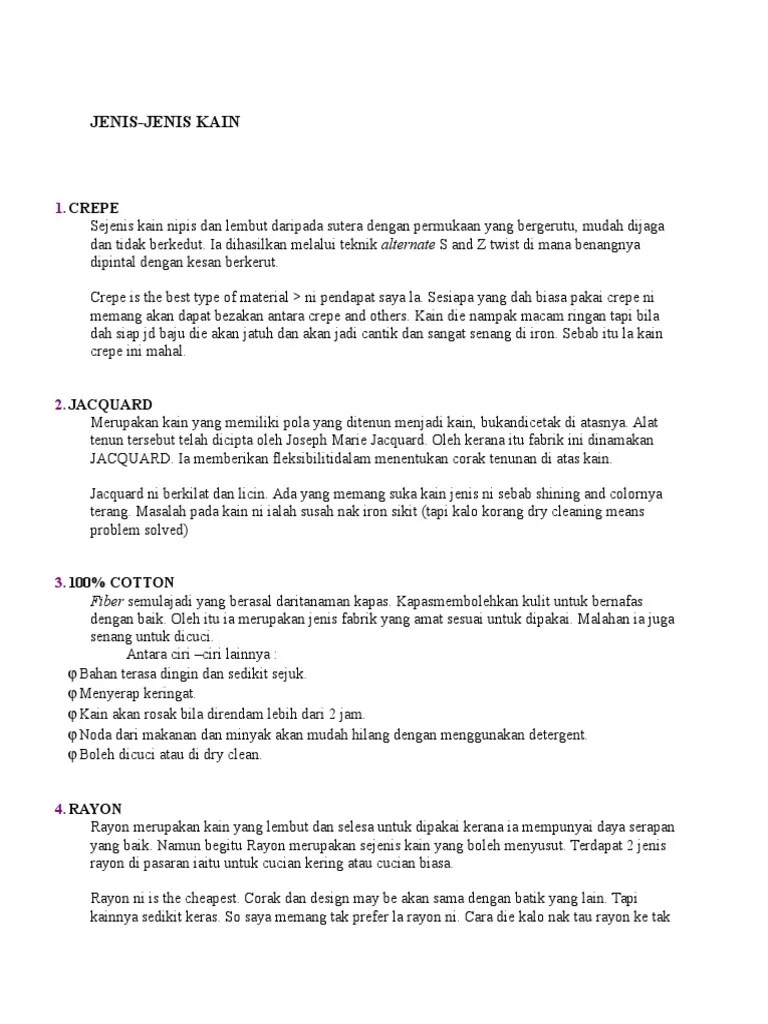 Jenis kain pakaian basahan dirumah selalunya diperbuat daripada kain kapas ataupun kain yang tidak terlalu mahal. Terdapat berbagai jenis kain satin, namun yang paling sering digunakan untuk baju gamis yaitu jenis satin duchesse. Fabrik crepe ini juga terdapat banyak jenis seperti satin crepe, poly . Look lovely in wonderful, traditional jenis baju kurung from lazada.com.my. Kain jenis ini biasanya di buat t shirt, legging, pakaian sukan dan . Kebiasaanya di gunakan pada baju kurung atau di belakang sulaman . Sesuai dijadikan baju kurung tradisional mahupun moden. Uniknya, hari ini dengan kehadiran banyak fabrik di pasaran tekstil, baju kurung turut dihasilkan daripada pelbagai jenis kain mengikut cita .